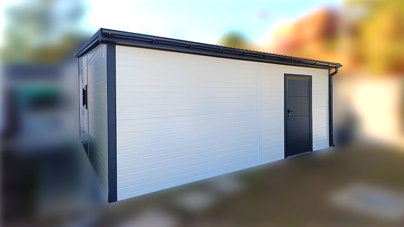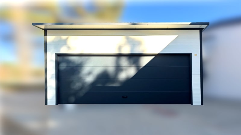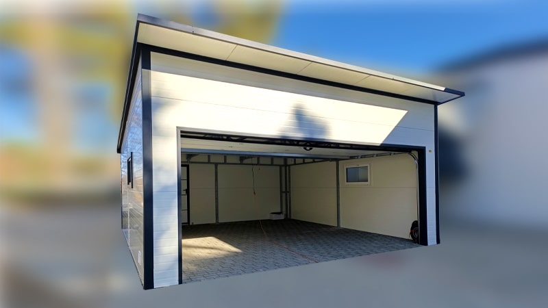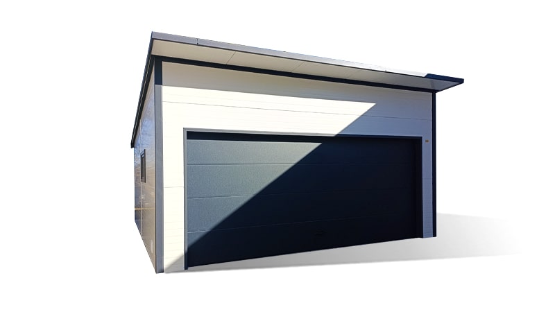 6x6m-es DELUX szigetelt mobilgarázs, hátra lejtő tetővel, fehér falakkal, antracitszürke szekcionált kapuval és ajtóval, szegélyekkel, ereszcsatonával, horganyzott vázszerkezettel