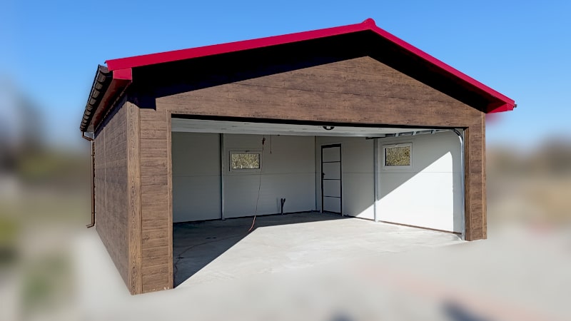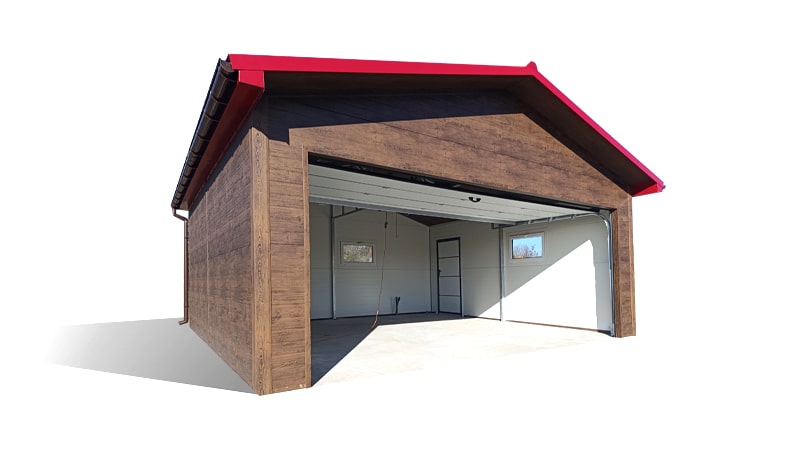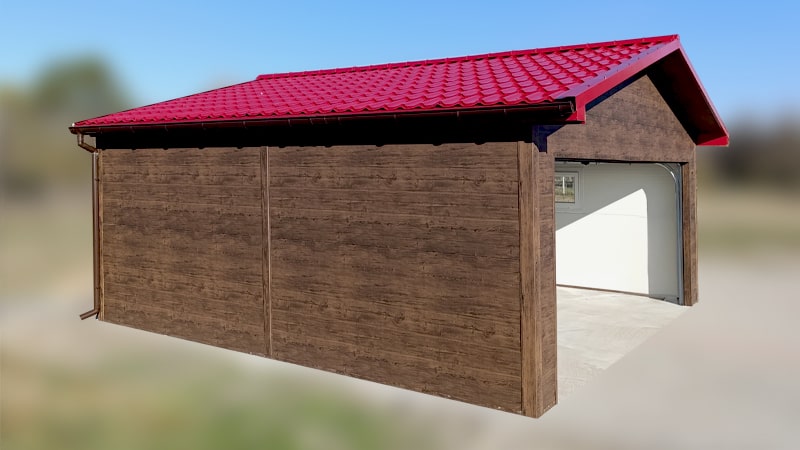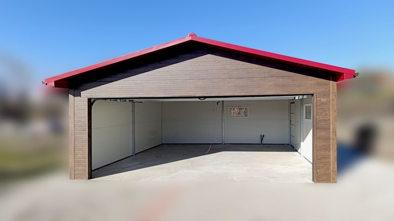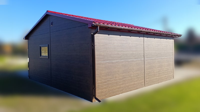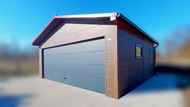 6×5,8m-es DELUX szigetelt mobilgarázs, nyeregtetővel, sötét diófa falakkal, antracitszürke szekcionált kapuval és ajtóval, szegélyekkel, ereszcsatonával, horganyzott vázszerkezettel