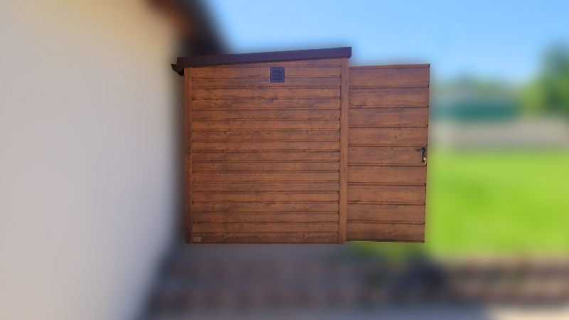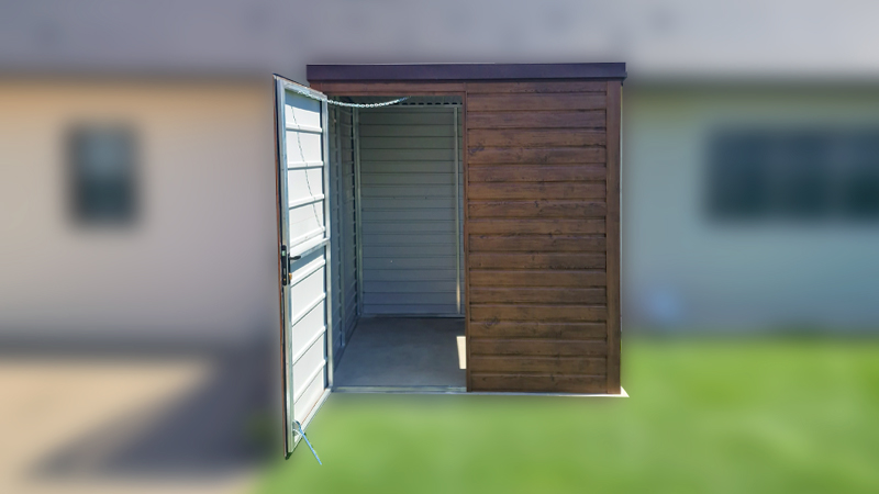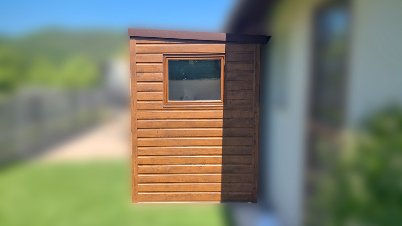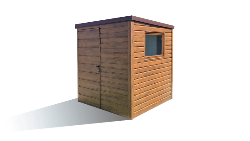 2×1,9m-es delux fém kerti tároló hátra lejtő tetővel, sötét diófa falakkal és ajtóval, csokoládébarna tetővel, ereszcsatornával, szegélyekkel, horganyzott vázszerkezettel, vízszintes lemezborítással
