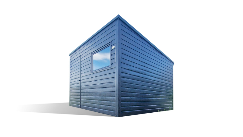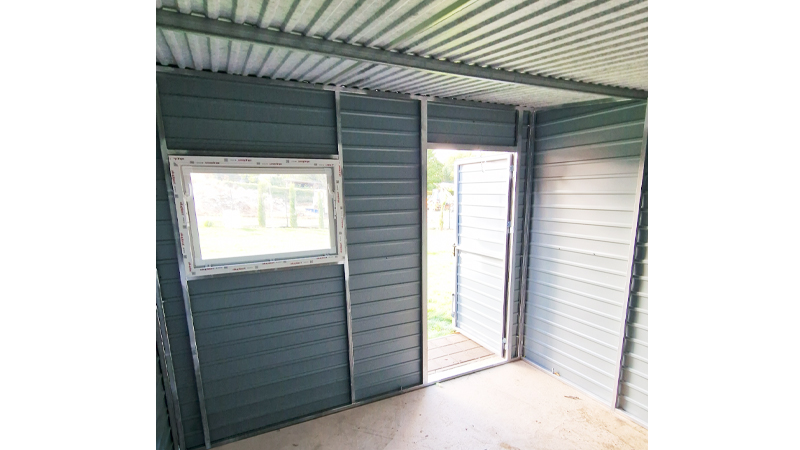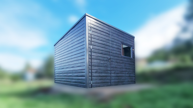3x3m-es delux fém kerti tároló hátra lejtő tetővel, fahatású szürke színben, ajtóval, ablakkal, ereszcsatornával, szegélyekkel, horganyzott vázszerkezettel, vízszintes lemezborítással