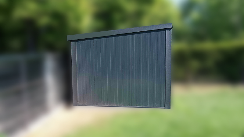 3,5x3m-es szigetelt tároló / motorgarázs / quadgarázs hátra lejtő tetővel, szekcionált kapuval, szegélyekkel, horganyzott vázszerkezettel